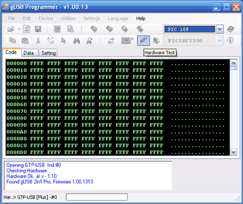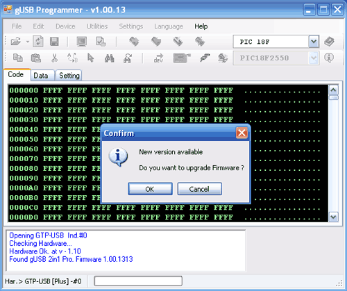 Tương tự, nếu hiện tại gUSB 3in1 Vista hay gUSB 3in1 microVista đang hỗ trợ nạp PIC32MX hay AVR muốn chuyển sang nạp PIC, bạn hãy chọn chip PIC trong combo box thứ nhất và click vào icon Test harware. Một thông báo xuất hiện, chọn OK và hãy chờ trong giây lát. Mạch nạp sẽ tự động kết lại với máy tính khi hoàn thành việc chuyển đổi. Khi đó bạn có thể sử dụng gUSB 3in1 Vista hay gUSB 3in1 microVista như một mạch nạp PIC. Tham khảo thêm hướng dẫn sử dụng mạch nạp PIC .